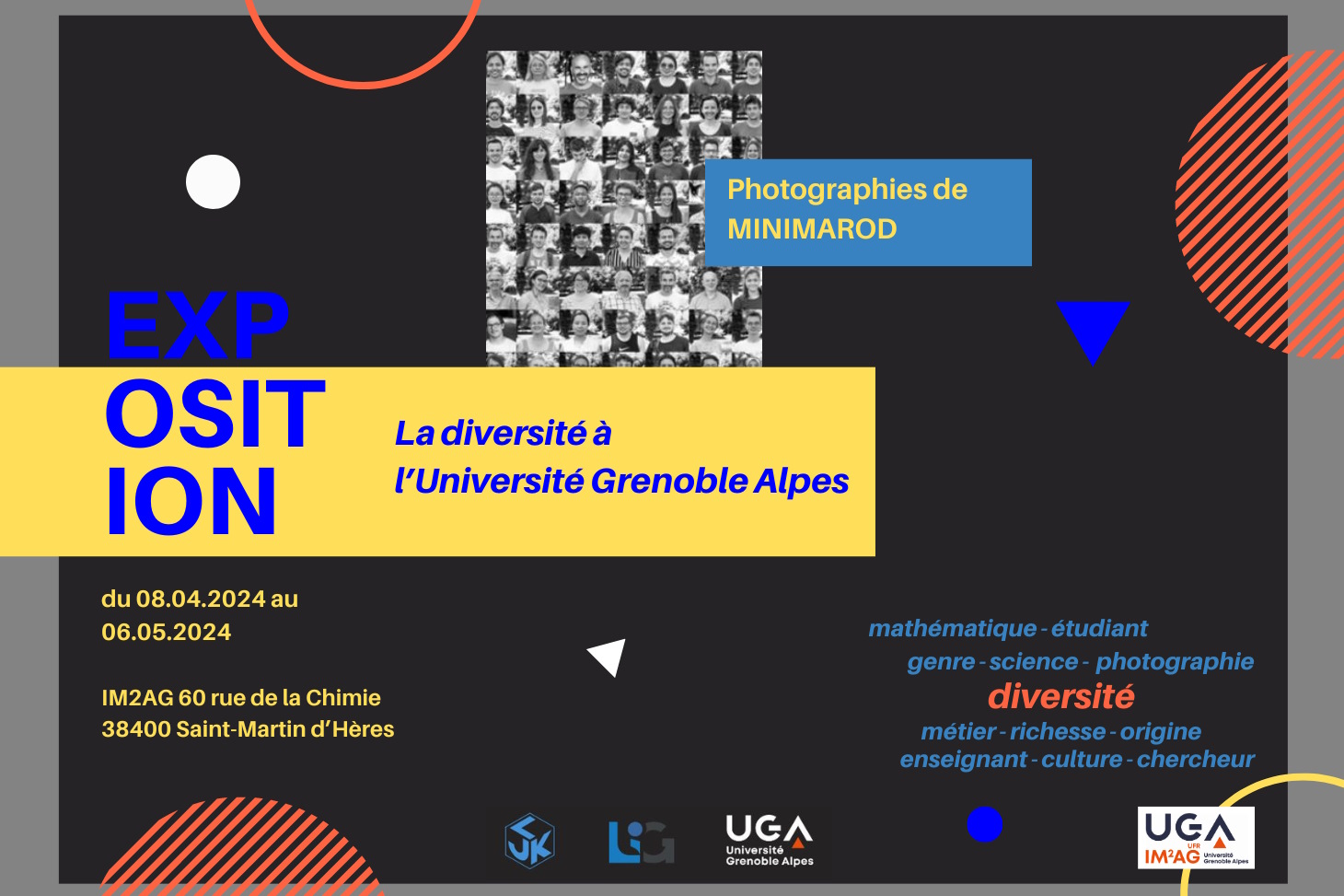 Le photographe Minimarod s'est constitué une collection de 75 photographies d'étudiant·e·s, enseignant·e·s, et personnel, sélectionnés au hasard parmi les personnes présentes à l'IM2AG et dans les laboratoires associés.